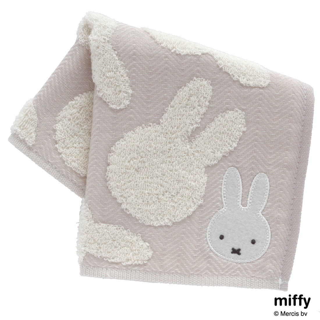 ガーゼ&パイルのタオルハンカチです。ヘリンボーン柄のガーゼ部分にパイルでミッフィーのシルエットを表現しました。