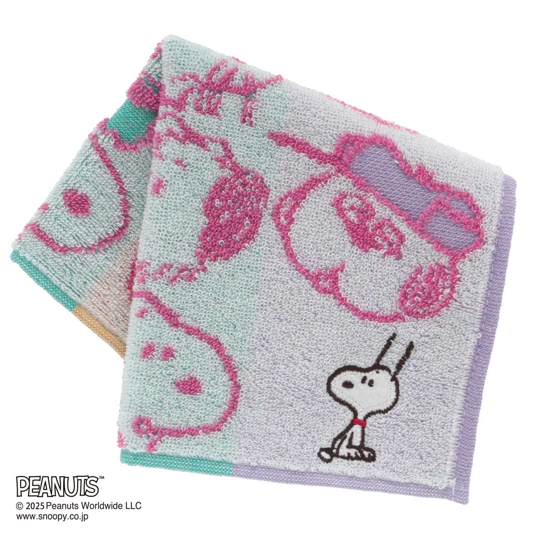 パイルジャカードタイプのタオルハンカチです。スヌーピーときょうだいたちのお顔が配列されたデザイン。右下のスヌーピーの刺繍は配色ごとにポーズ違いで3種類。