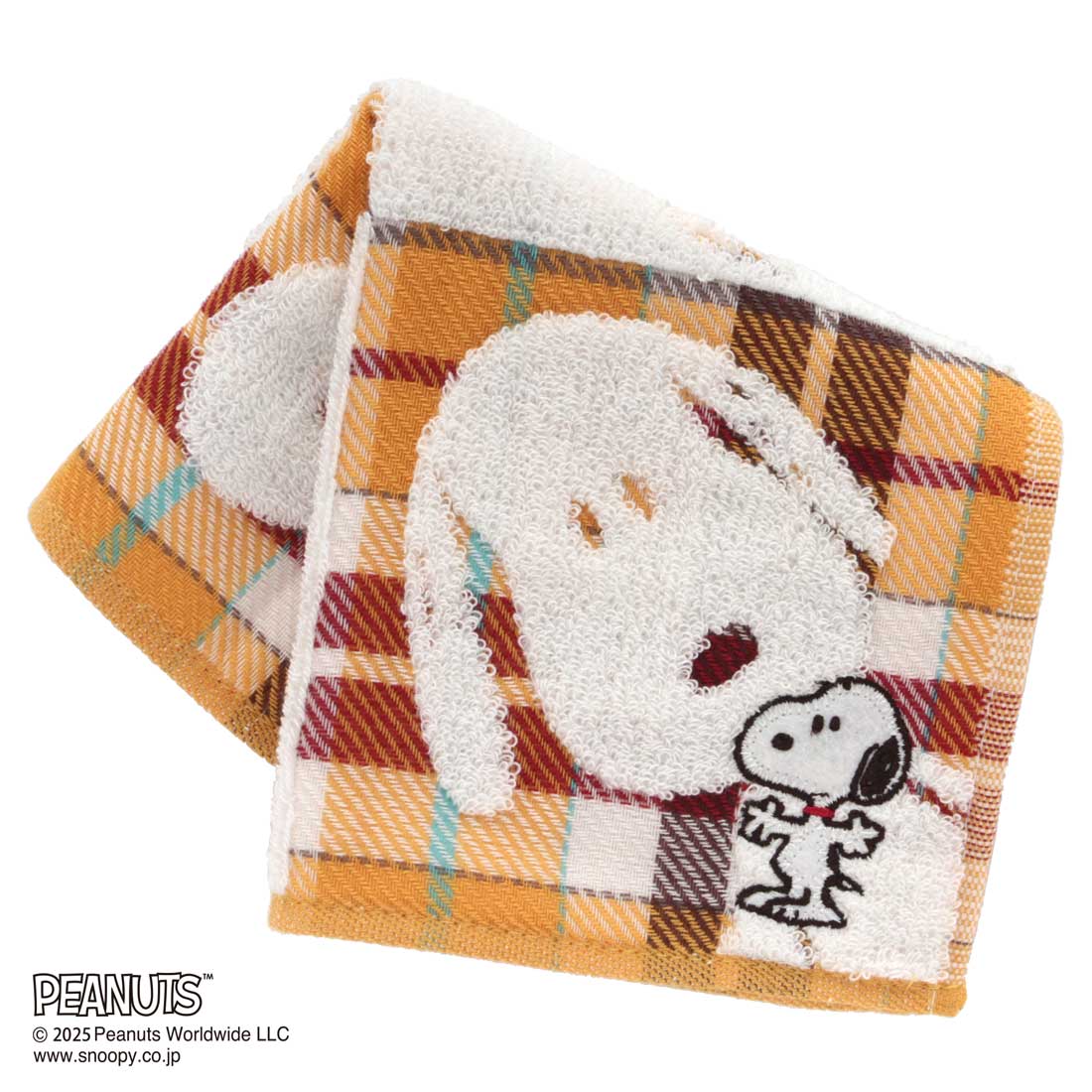 パイル&ガーゼタイプのタオルハンカチです。表情の異なるスヌーピーをレイアウトしました。ガーゼとパイルの凹凸感が特徴的な1枚です。