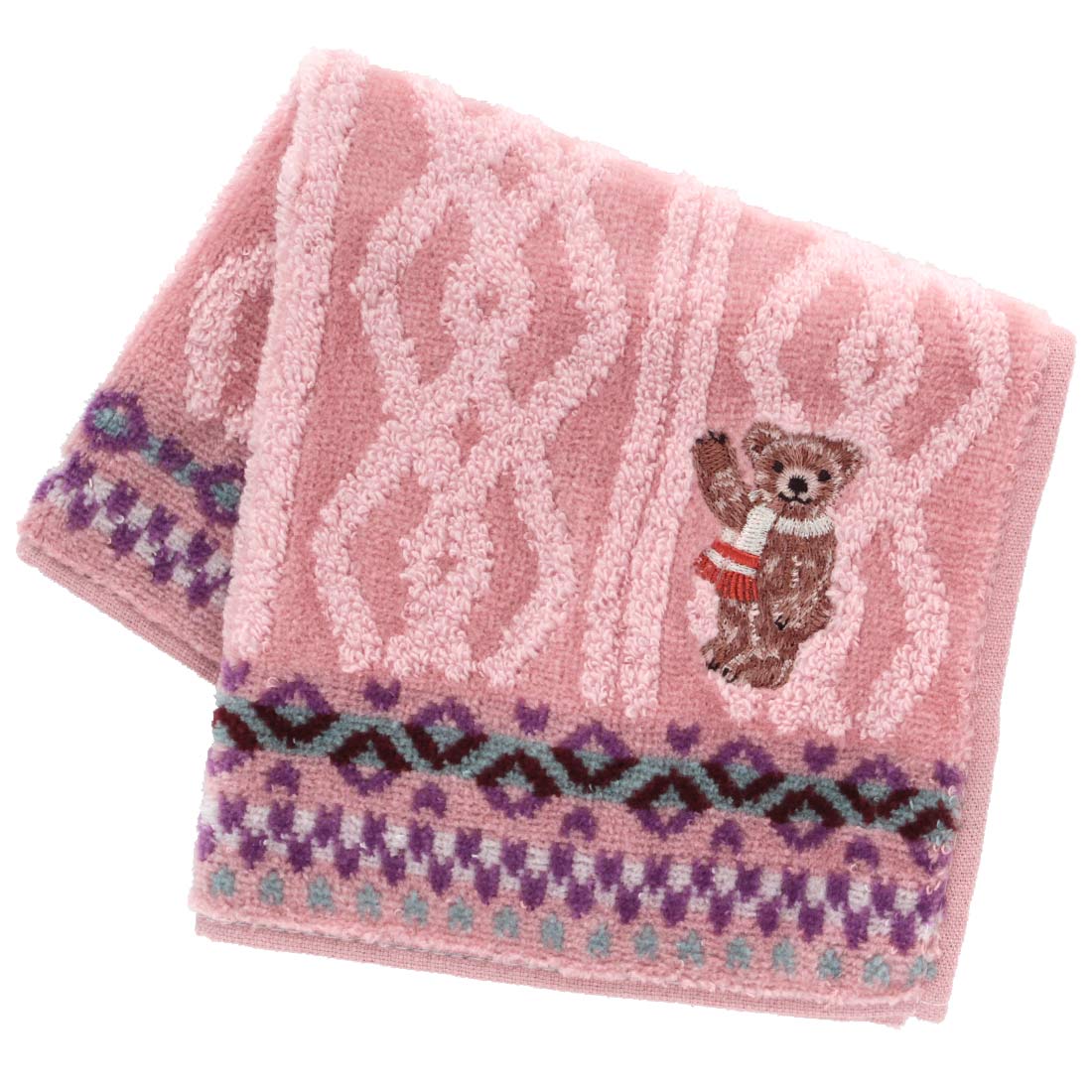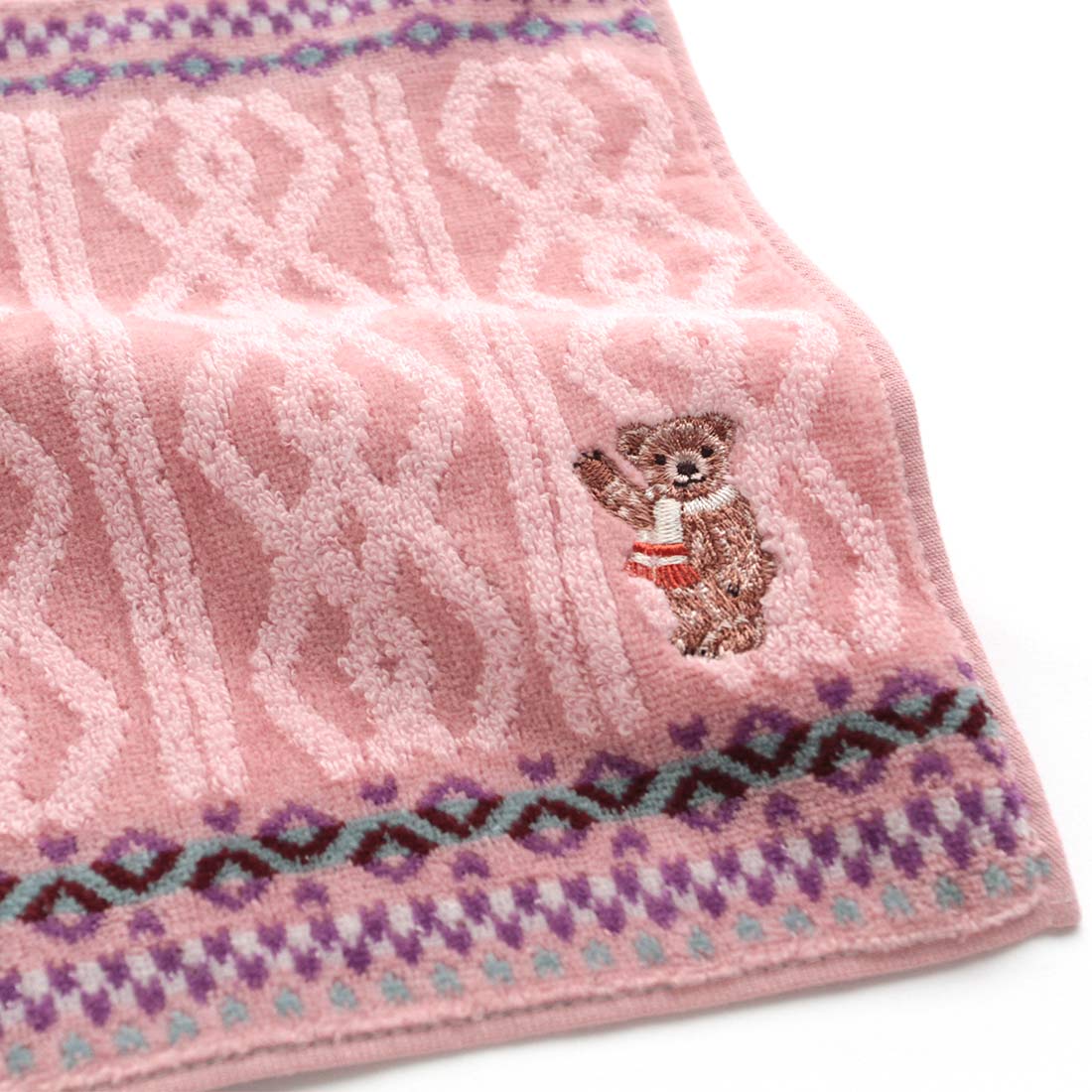 カラフルなフェアアイル模様が愛らしいタオルハンカチ。マフラーを巻いたクマの刺繍がポイントです。25cmの使いやすいサイズ。糸使いや縫製など、細部にまでこだわったタオルハンカチです。