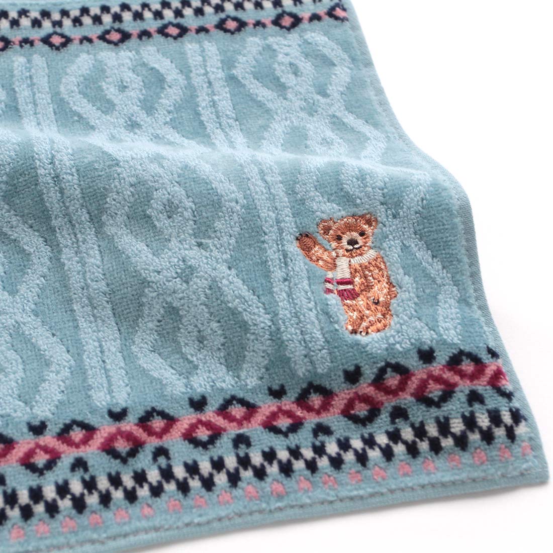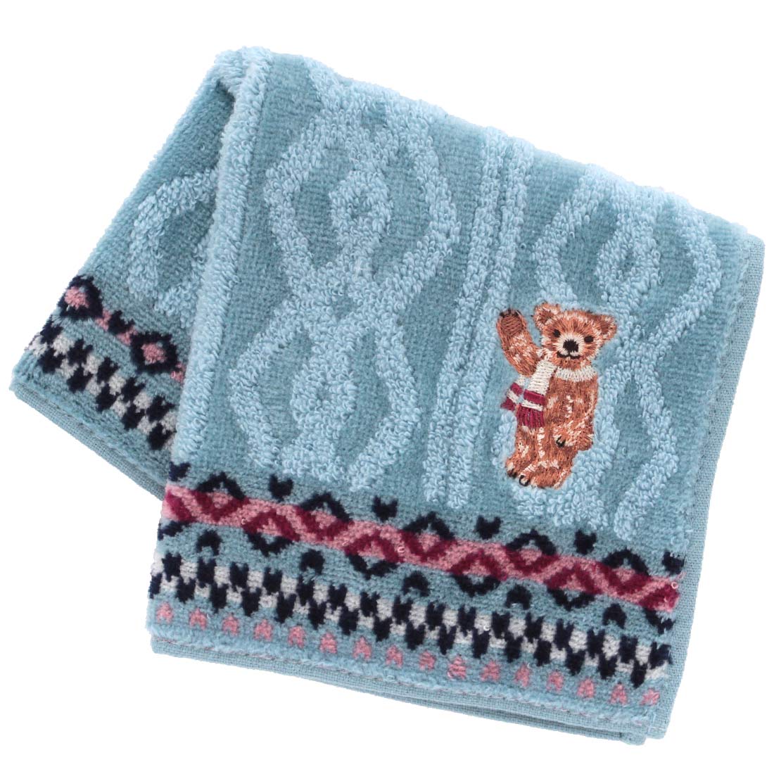 カラフルなフェアアイル模様が愛らしいタオルハンカチ。マフラーを巻いたクマの刺繍がポイントです。25cmの使いやすいサイズ。糸使いや縫製など、細部にまでこだわったタオルハンカチです。