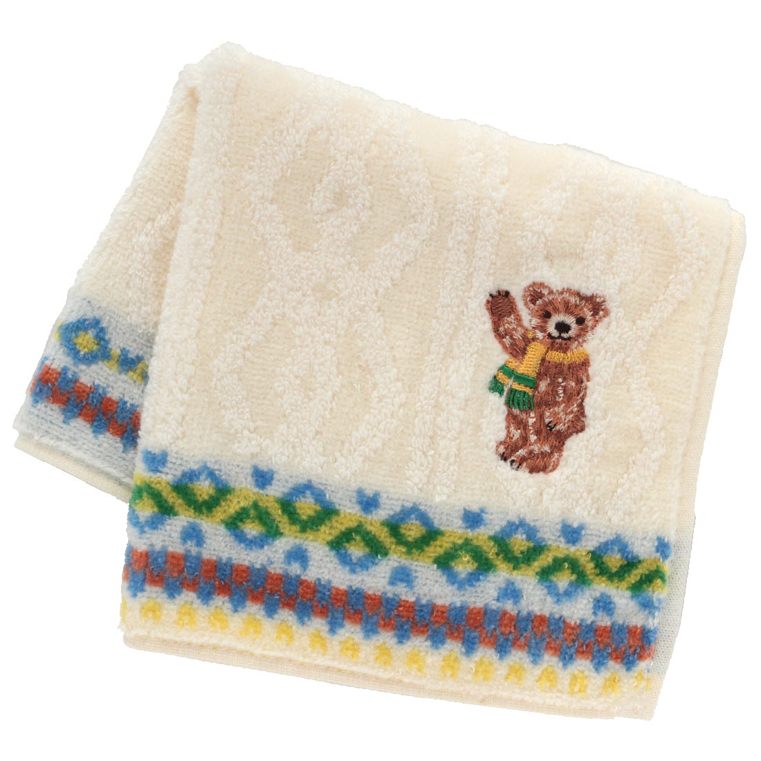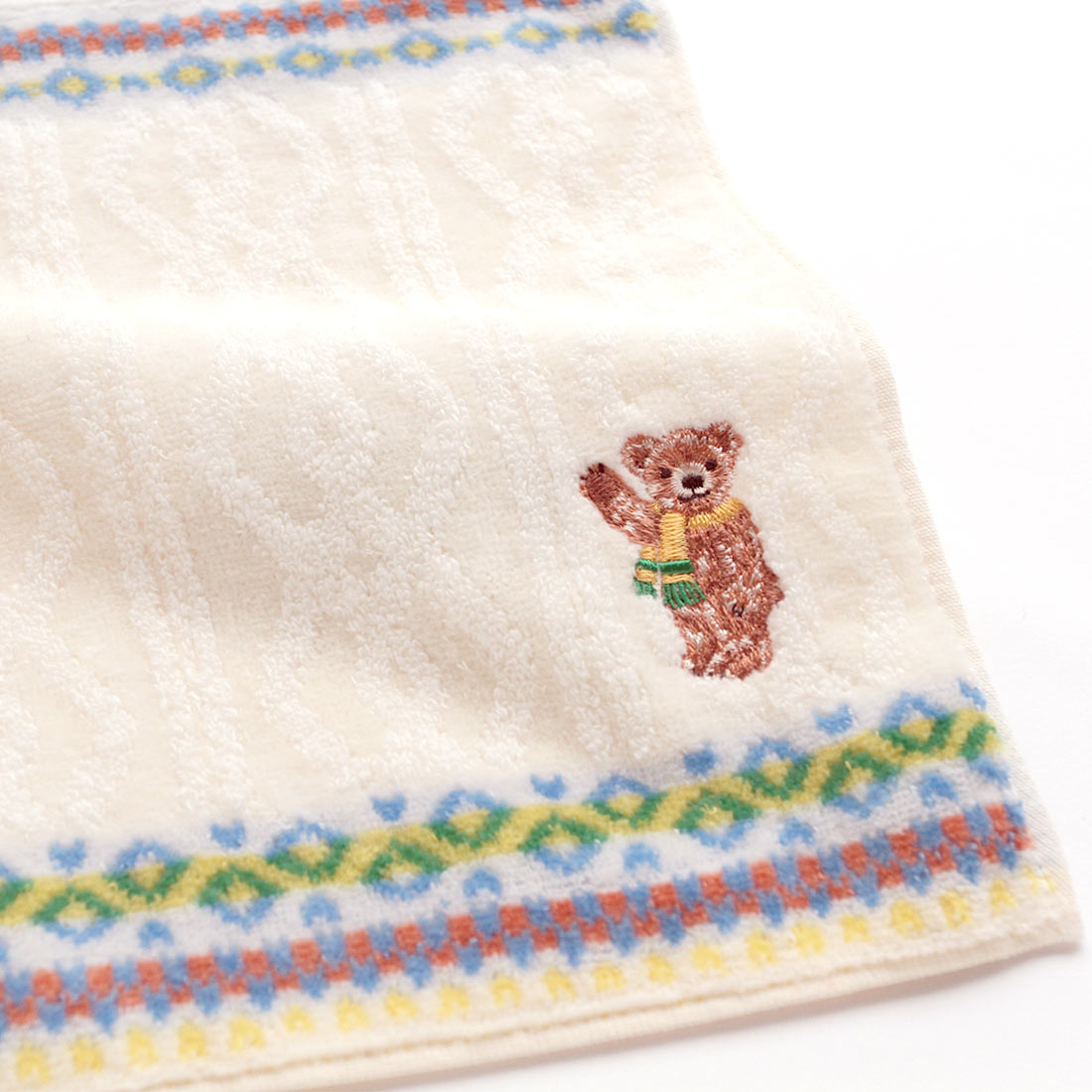 カラフルなフェアアイル模様が愛らしいタオルハンカチ。マフラーを巻いたクマの刺繍がポイントです。25cmの使いやすいサイズ。糸使いや縫製など、細部にまでこだわったタオルハンカチです。