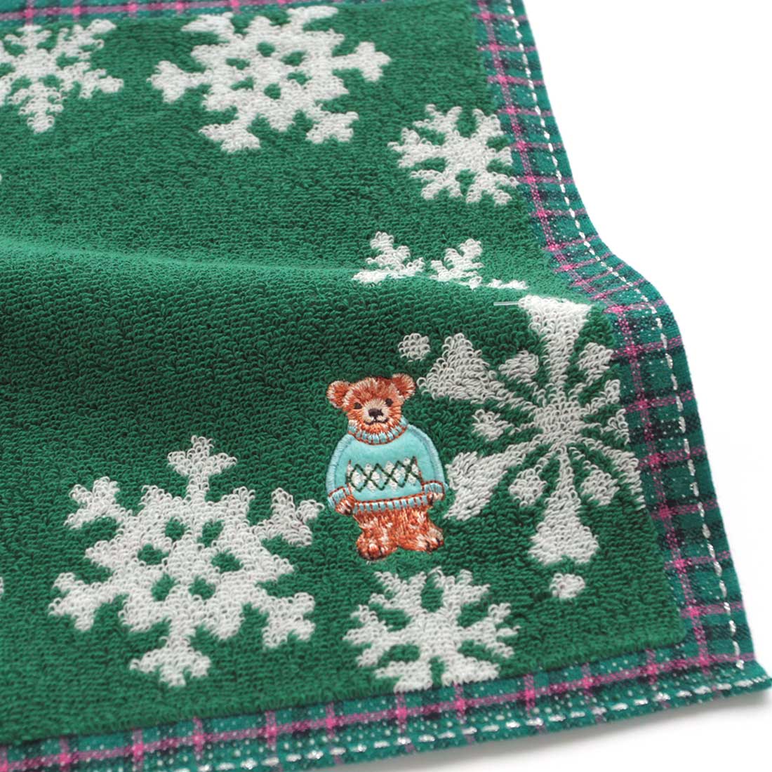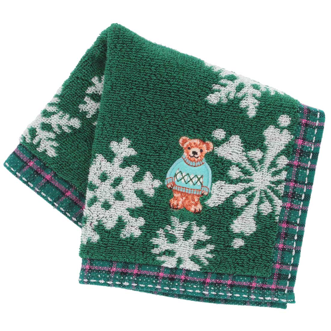 雪の結晶と額縁のチェックが季節を演出するタオルハンカチ。アーガイルのセーターを着たクマの刺繍がポイントです。25cmの使いやすいサイズ。糸使いや縫製など、細部にまでこだわったタオルハンカチです。