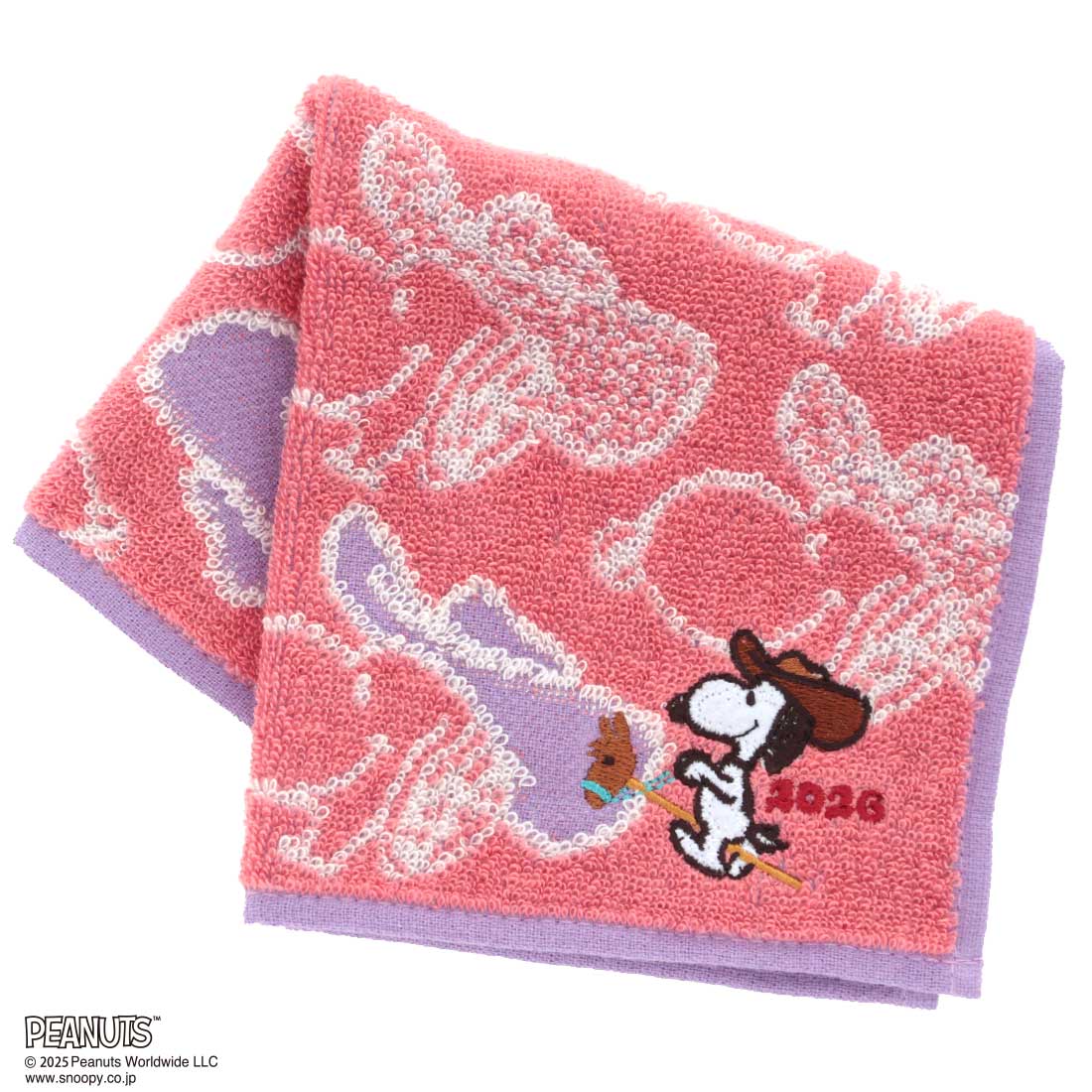 テンガロンハットをかぶったスヌーピーが特徴的なタオルハンカチです。右下の棒馬にまたがるスヌーピーと2026の刺繍がポイントです。